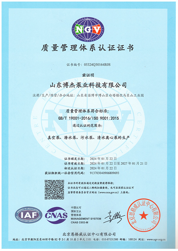 山東博杰泵業科技有限公司,始創于2001年,前身為山東博山博杰工業泵廠。總部位于中國泵業名城-山東博山,是一家專業生產泵類設備的企業。我公司一貫重視科技創新和質量管理,公司自有實用新型專利14項,目前公司產品均已通過ISO9001質量管理體系認證,且與國內多所高校科研機構建立了合作,2023年先后被認定為國家高新技術企業,國家科技型中小企業。公司還是中國真空協會會員單位,市級守合同重信用企業、區級先進基層黨組織、區級黨員誠信經營示范企業、山東理工大學畢業生就業實踐基地、山東省文明誠信民營企業、淄博市私營企業協會理事單位。